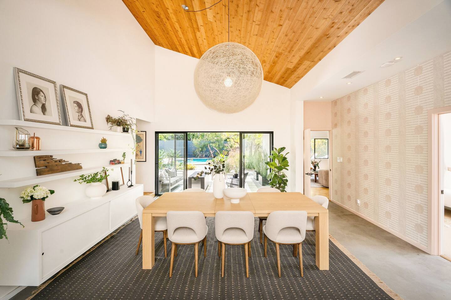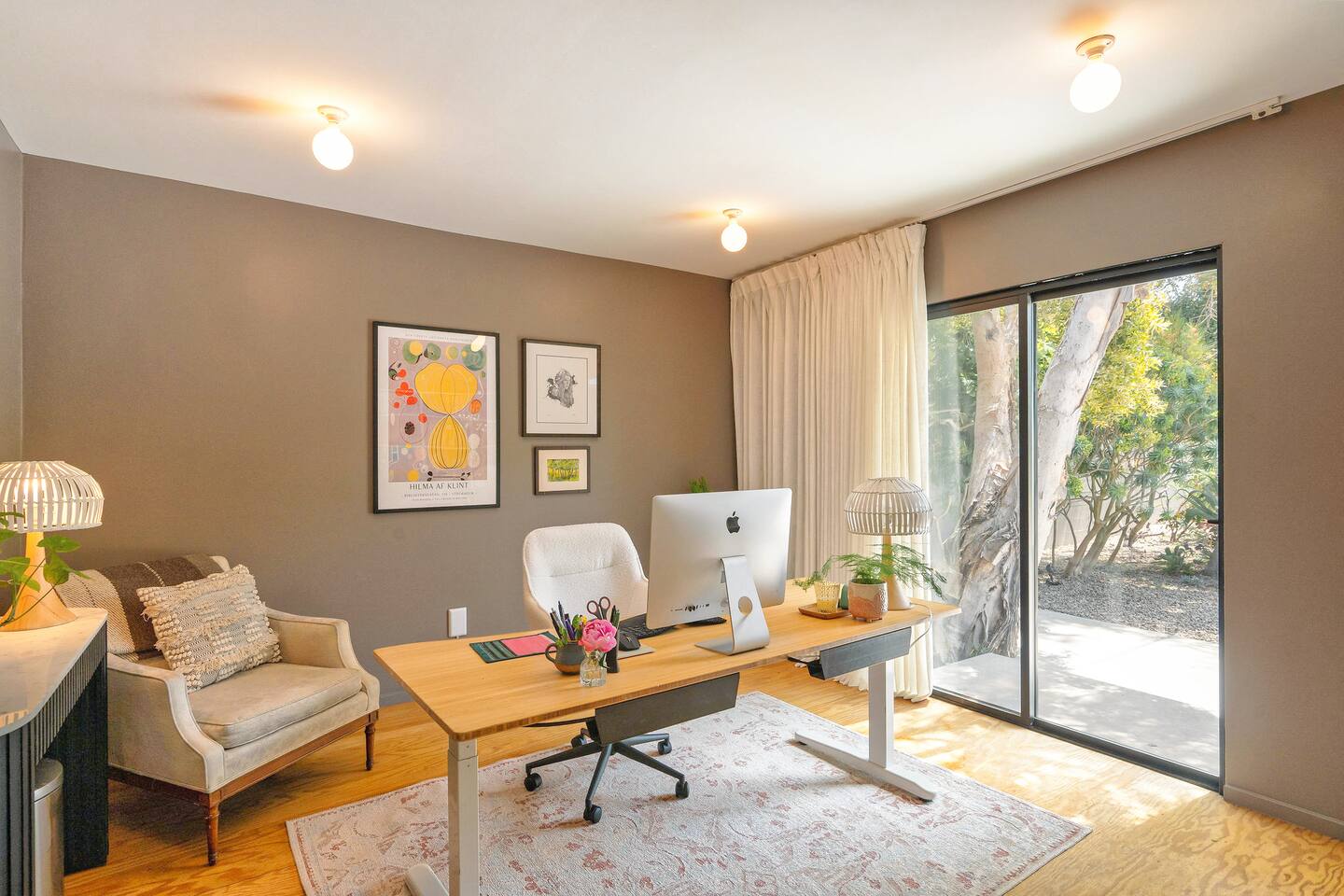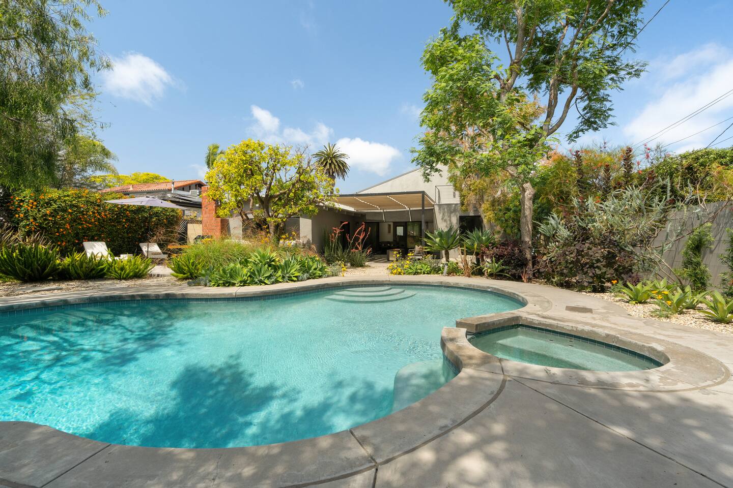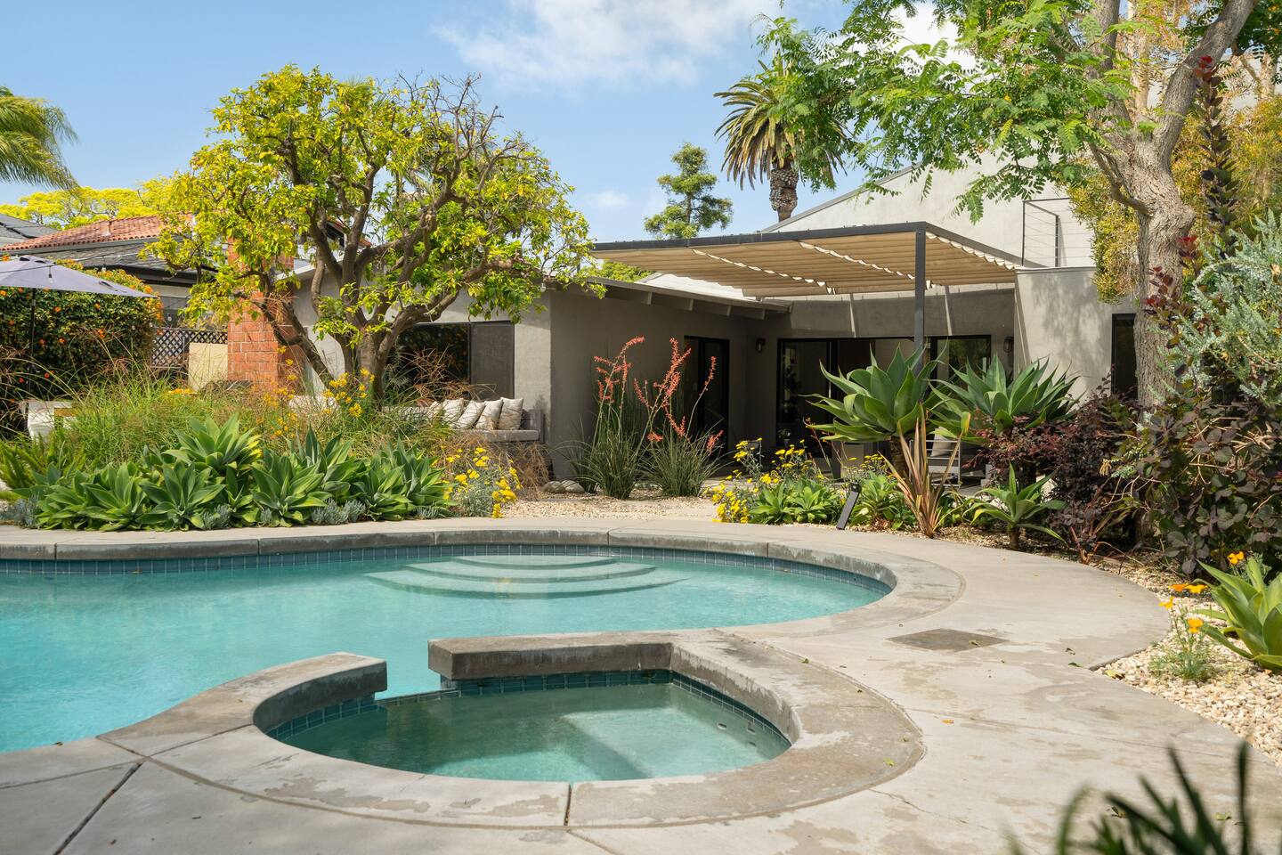 Welcome to the Sunshine Oasis – a serene and sun-drenched 4-bedroom 2-bathroom (+ private office) retreat tucked away on a quiet street minutes from Venice, Santa Monica and Culver City, in the heart of the Westside. This home blends laid-back mid-century luxury with lush, magazine-worthy grounds. The open-concept living spaces flow effortlessly into a private backyard oasis featuring a sparkling pool, jacuzzi, two fire pits, outdoor grill and dining area, plus magical nooks for relaxation.